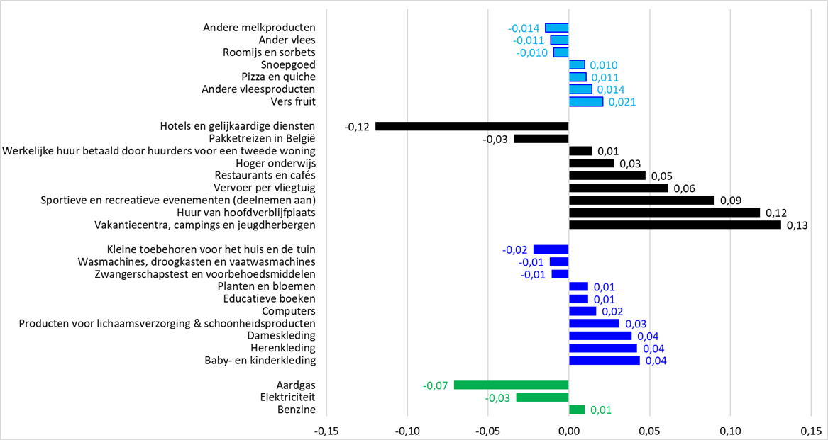 De dalingen bij enkele vakantiegerelateerde categorieën waren eveneens aanzienlijk. Het gaat in het bijzonder om de prijzen van hotels en van vakanties in België of in het buitenland.