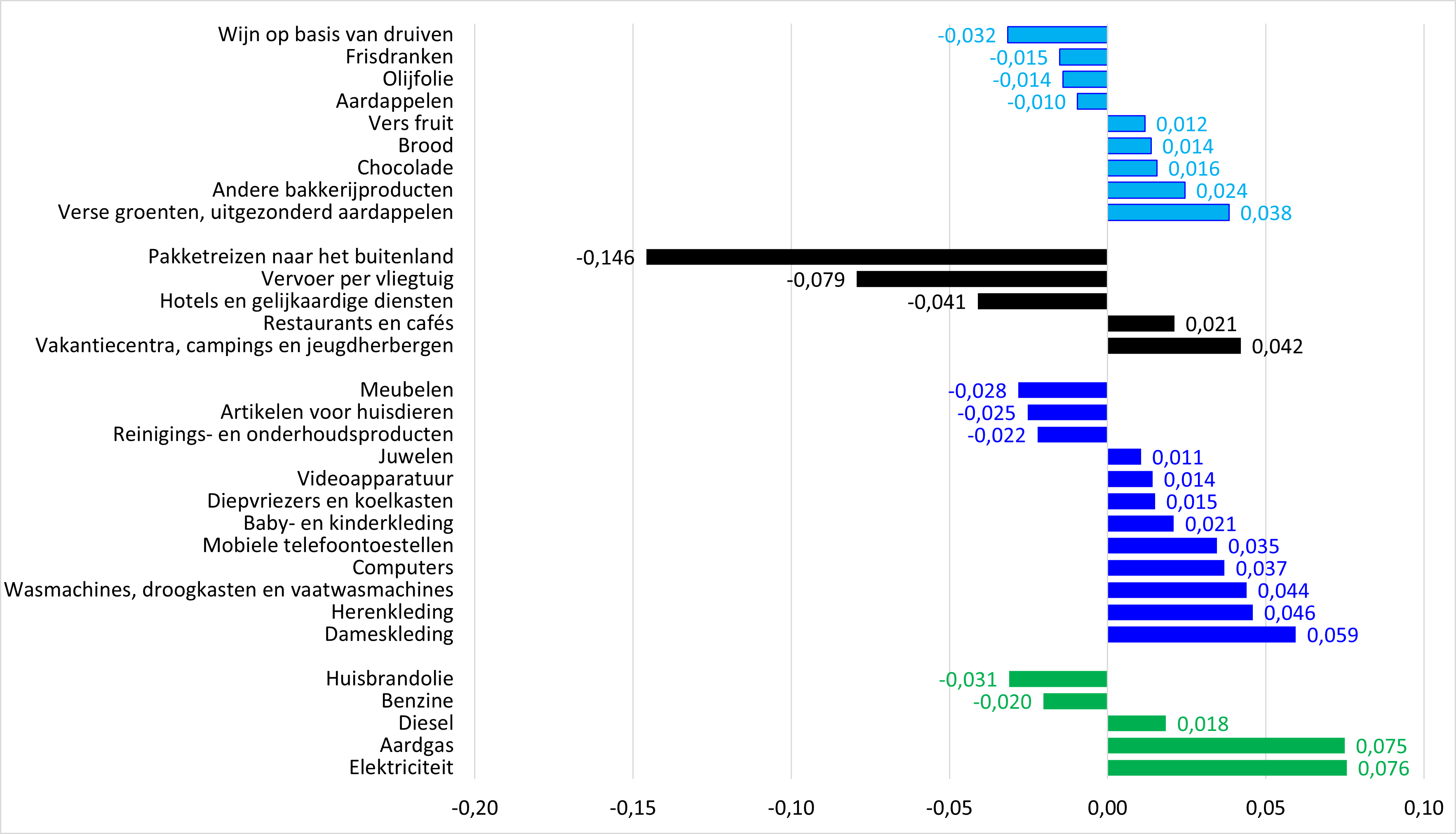 Als we de prijsdalingen bekijken, zien we dat de overwegend neerwaartse impact van diensten vooral toe te schrijven is aan enkele categorieën gerelateerd aan reizen en vakanties (buitenlandse vakanties, vliegtickets, hotels). Verder zijn de grootste prijsdalingen te vinden bij huisbrandolie en brandstoffen (energie), meubels, huisdierproducten en schoonmaakproducten (goederen) en, wat voeding betreft, bij alcoholische of niet-alcoholische dranken en oliën & vetten (zoals olijfolie). Verder waren er beperkte prijsdalingen voor treinvervoer, mobiele telefonie, speelgoed, kantoorartikelen en dvd's.