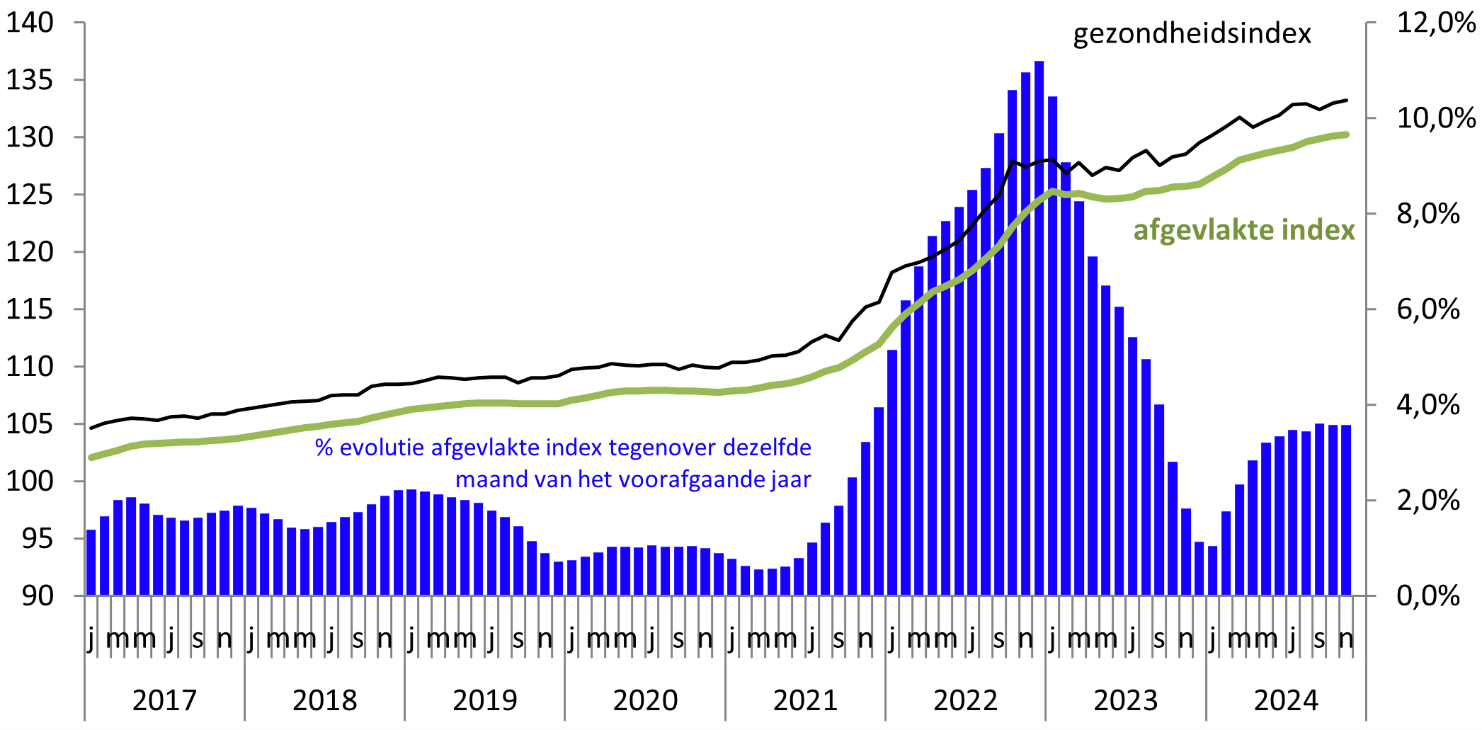 De gezondheidsindex voor november staat op 133,22 punten, wat neerkomt op een evolutie op jaarbasis van 3,63%. Hier daalt de inflatie niet.